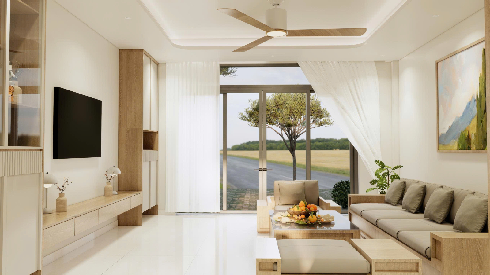 Phòng khách được thiết kế theo phong cách hiện đại, sử dụng sofa gỗ kết hợp đệm sáng màu tạo cảm giác ấm cúng và sang trọng.