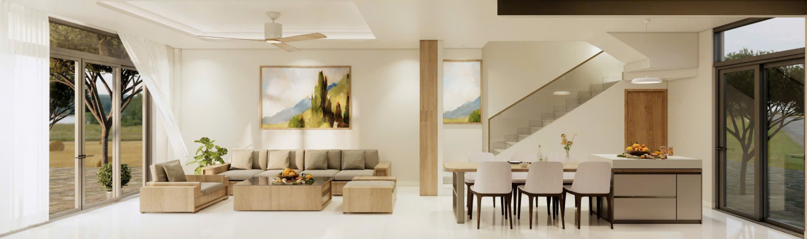 Dựa trên hình ảnh thực tế, toàn bộ khu vực sinh hoạt chung được tận dụng tối đa ánh sáng tự nhiên từ hệ cửa kính lớn. Ánh sáng kết hợp cùng tone màu sáng giúp không gian luôn thoáng đãng và rộng rãi hơn.