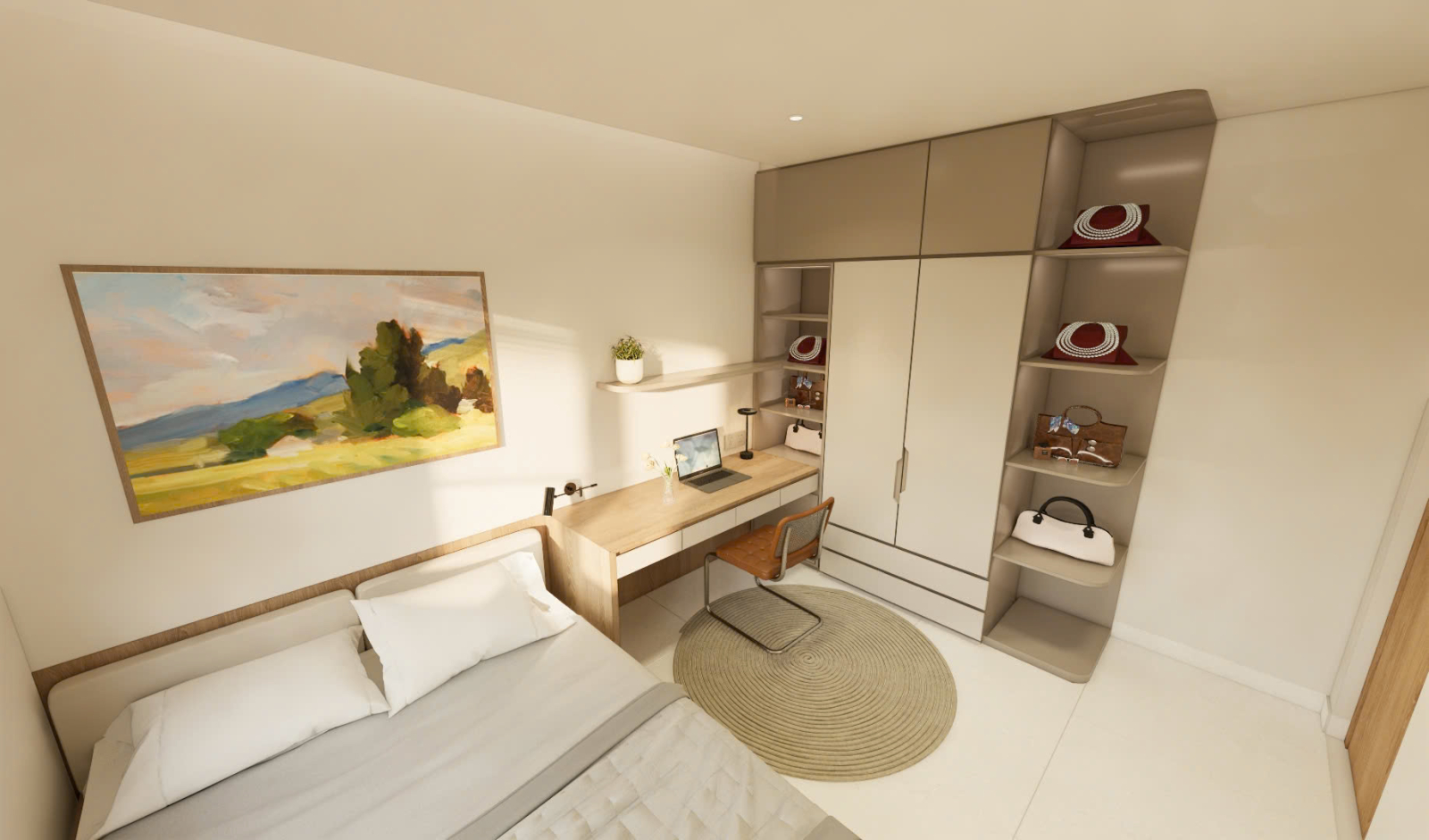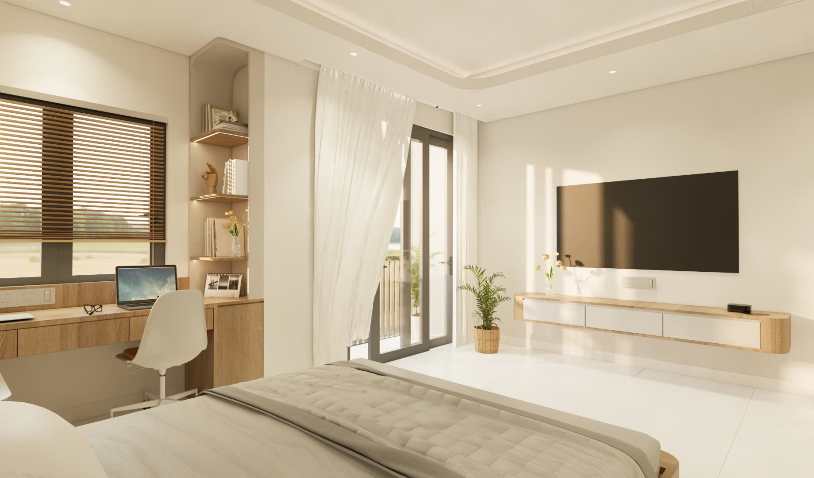 Một điểm cộng lớn của công trình là khu vực bàn làm việc được thiết kế liền mạch với tổng thể. Vị trí đặt gần cửa sổ giúp tận dụng ánh sáng tự nhiên, tạo cảm giác thoải mái khi làm việc hoặc học tập.
