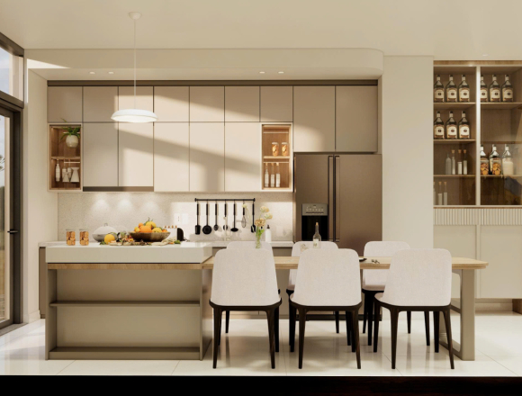 Toàn bộ không gian được thiết kế liên kết chặt chẽ giữa phòng khách, bàn ăn và khu vực bếp. Điều này giúp tăng sự kết nối trong sinh hoạt hàng ngày.