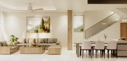 Thiết kế thi công nội thất phòng khách bếp tối giản hiện đại, không gian mở sang trọng, tối ưu công năng. Nội Thất DC thi công uy tín.