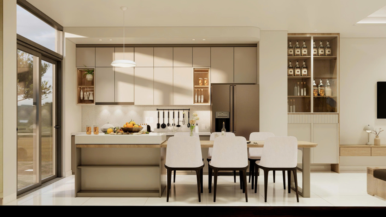 Toàn bộ không gian được thiết kế liên kết chặt chẽ giữa phòng khách, bàn ăn và khu vực bếp. Điều này giúp tăng sự kết nối trong sinh hoạt hàng ngày.